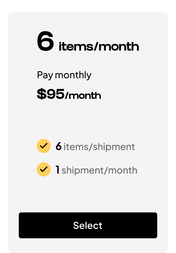 While our standard plans offer up to 10 items and up to 2 shipments each month, we have the flexibility to customize our plans to your needs. Choose the plan that fits your lifestyle, and enjoy a steady stream of fresh, stylish outfits. Along the way, if you decide you want more or less, you can simply change the number of clothes or shipments to adapt to your changing needs.