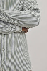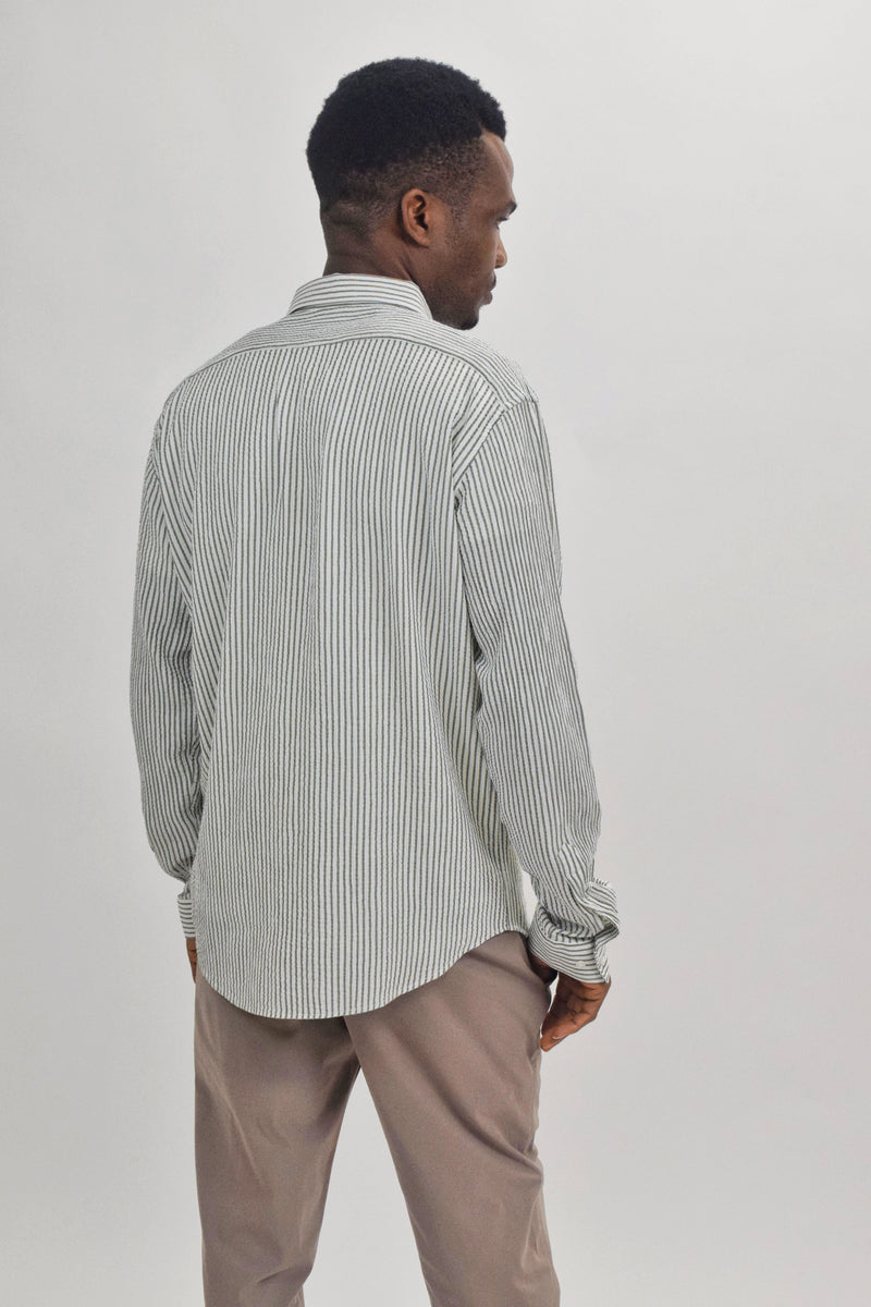 Introducing the Suit Sartoria button-up shirt, a perfect blend of modern design and classic elegance. This lightweight top is crafted from a breathable mix of cotton and polyester, ensuring comfort throughout the day. The shirt features a distinctive crinkle-cut fabric with horizontal stripes in shades of green and white, adding a contemporary touch to your wardrobe. Its slim fit and button-up closure make it a versatile piece suitable for various occasions. For a date night look, pair this shirt with tailored trousers and loafers. It also works well for a vacation/resort setting when combined with light chinos and casual sneakers. For a cocktail party, style it with dark jeans and a sleek blazer. For a smart-casual vibe, throw on the Suit Sartoria crinkle-cut button-up shirt with tan chinos and brown loafers.