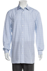 Introducing our classic blue plaid shirt, a timeless addition to any wardrobe. Crafted from 100% cotton, this lightweight woven top features a point collar and long sleeves with one-button rounded cuffs, offering both comfort and style. The subtle plaid print adds a touch of sophistication, making it perfect for year-round wear. Ideal for those who appreciate a classic, preppy, and minimal aesthetic. For a business casual look, pair this shirt with tailored trousers and leather shoes. It's also perfect for a date night when combined with dark jeans and a sleek blazer. Swap in the Brioni shirt for another sophisticated style.