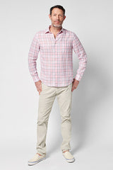 The Faherty Pink/Grey Plaid Linen Long Sleeve Button Up provides the perfect blend of style and comfort. Crafted from a lightweight linen fabric, this button up is designed for breathability and mobility. The bold pink and grey plaid pattern pairs well with the Faherty Light Khaki Lightweight Chino for a casual weekend look.