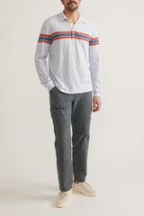 Introducing our classic striped top, a perfect blend of style and comfort. This top features old-school stripes in a striking combination of blue and orange, set against a light blue background. Crafted from 100% cotton with a slub yarn texture, it offers a unique depth and lightweight feel, making it ideal for year-round wear. The ribbed cuffs and hem add a touch of athletic flair, while the standard fit ensures comfort and versatility. This top is a staple for any wardrobe, effortlessly combining classic and preppy styles. For a relaxed vacation look, pair this top with khaki shorts and boat shoes. It's also perfect for a cocktail party when styled with dark jeans and loafers. Pair the Marine Layer polo with the Projek Raw pants and finish the look with sneakers.