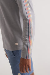 Introducing the Technical Air Crew Tee, a perfect blend of style and comfort. This classic fit top features a solid grey color with a unique touch of colorful stripe detailing along the sleeves, adding a subtle yet stylish flair. Crafted from a midweight knit fabric, it is designed for year-round wear, ensuring both breathability and durability. The crew neckline and long sleeves make it a versatile piece suitable for various occasions, from smart casual outings to everyday wear. For a relaxed vacation look, pair this top with light-colored shorts and casual sneakers. It's also perfect for a cocktail party when styled with tailored trousers and loafers. For relaxed days, pair the Marine Layer Grey Striped Sleeve Air Crew Tee with the khaki chinos. Add the overshirt to keep things interesting.