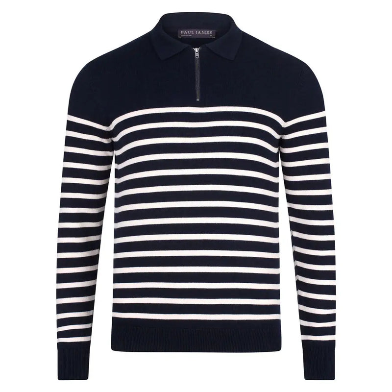 Paul James Navy Breton Stripe Collared Zip Polo Sweater
