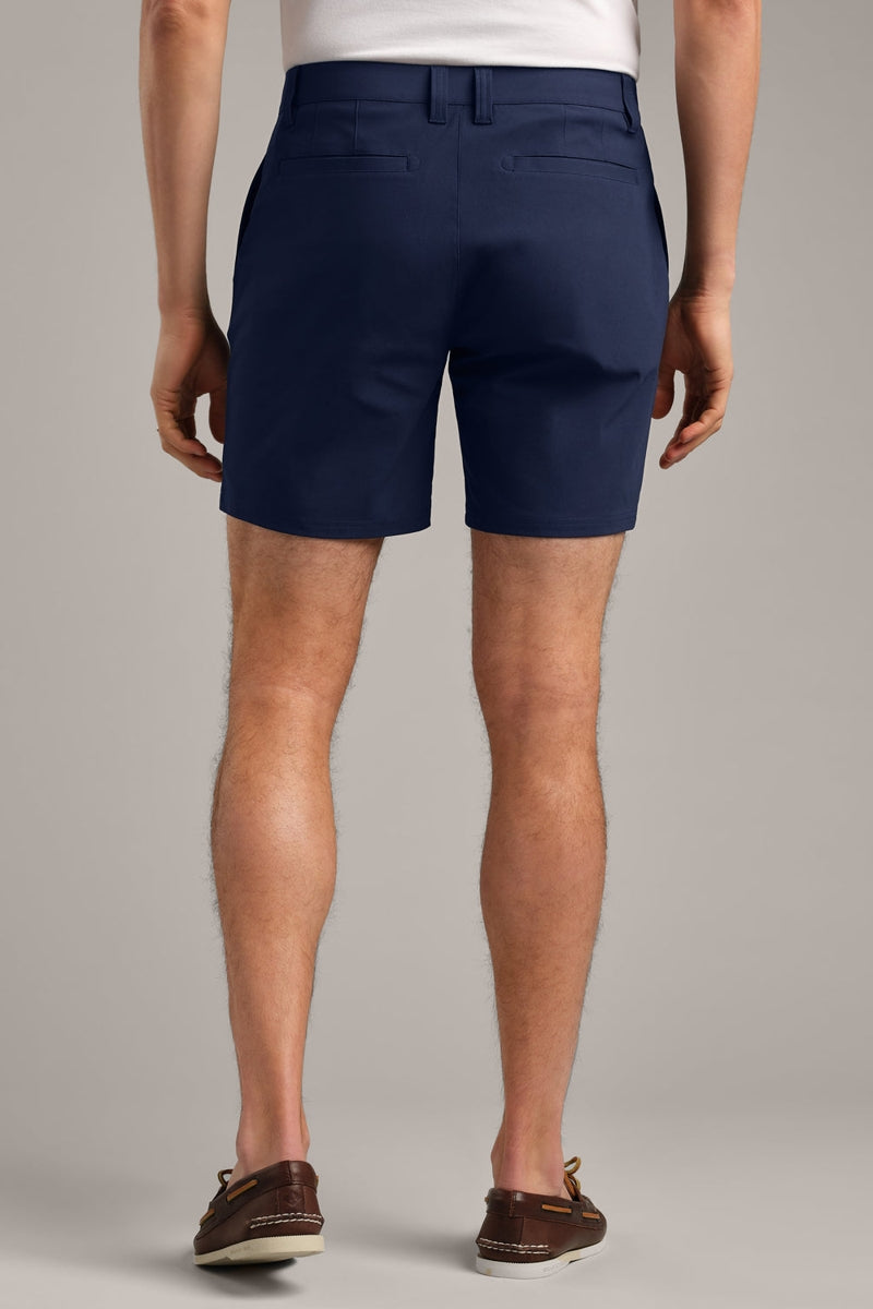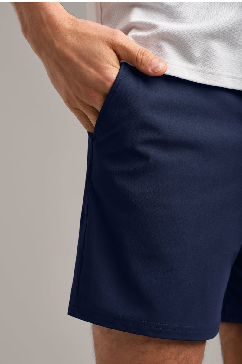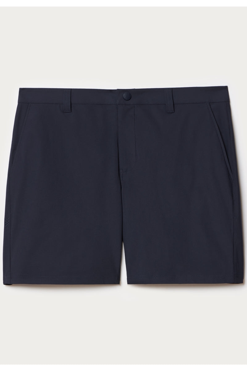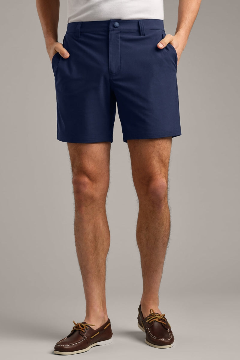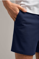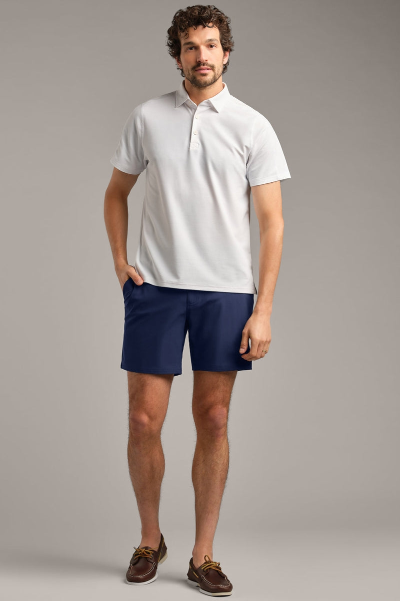 Introducing our classic navy blue shorts, designed for the modern man who values both style and functionality. These shorts are crafted from a lightweight, performance fabric that ensures maximum mobility and comfort, making them perfect for warm weather. The solid color and minimalistic design offer a timeless appeal, while the wrinkle-resistant feature keeps you looking sharp all day. Ideal for everyday casual wear, these shorts are a versatile addition to your wardrobe. For a relaxed vacation/resort look, pair these shorts with a light linen shirt and boat shoes. For a laid-back yet polished outfit, start with the Rhone White/Black Double Stripe Slim Performance Polo. Pair it with the Rhone Navy 7" Flex-Knit Shorts for a comfortable fit with a tailored look. To tie it all together, add a pair of crisp white low-top sneakers. It’s a simple but elevated combo that’s great for brunch, a walk around town, or a casual hangout.