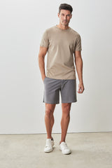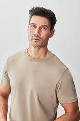 Introducing our classic tan short-sleeve crew neck t-shirt, crafted from 100% USA grown Pima cotton. This top is designed for those who appreciate minimalistic elegance and comfort. With its solid color and lightweight fabric, it is perfect for warm weather and versatile enough for various occasions, from everyday casual to smart casual settings. The soft water finishing ensures a luxurious hand feel and a clean appearance, making it a staple piece in any wardrobe. For a relaxed vacation look, pair this t-shirt with light-colored shorts and casual loafers. It's also ideal for a cocktail party when styled with tailored trousers and sleek sneakers. Pair the Robert Barakett tee with Bonobos pants for an all-day option in warmer weather.