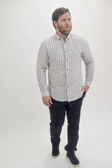 Spazio White & Beige Thick Vertical Stripe Linen Long Sleeve Button Up Shirt