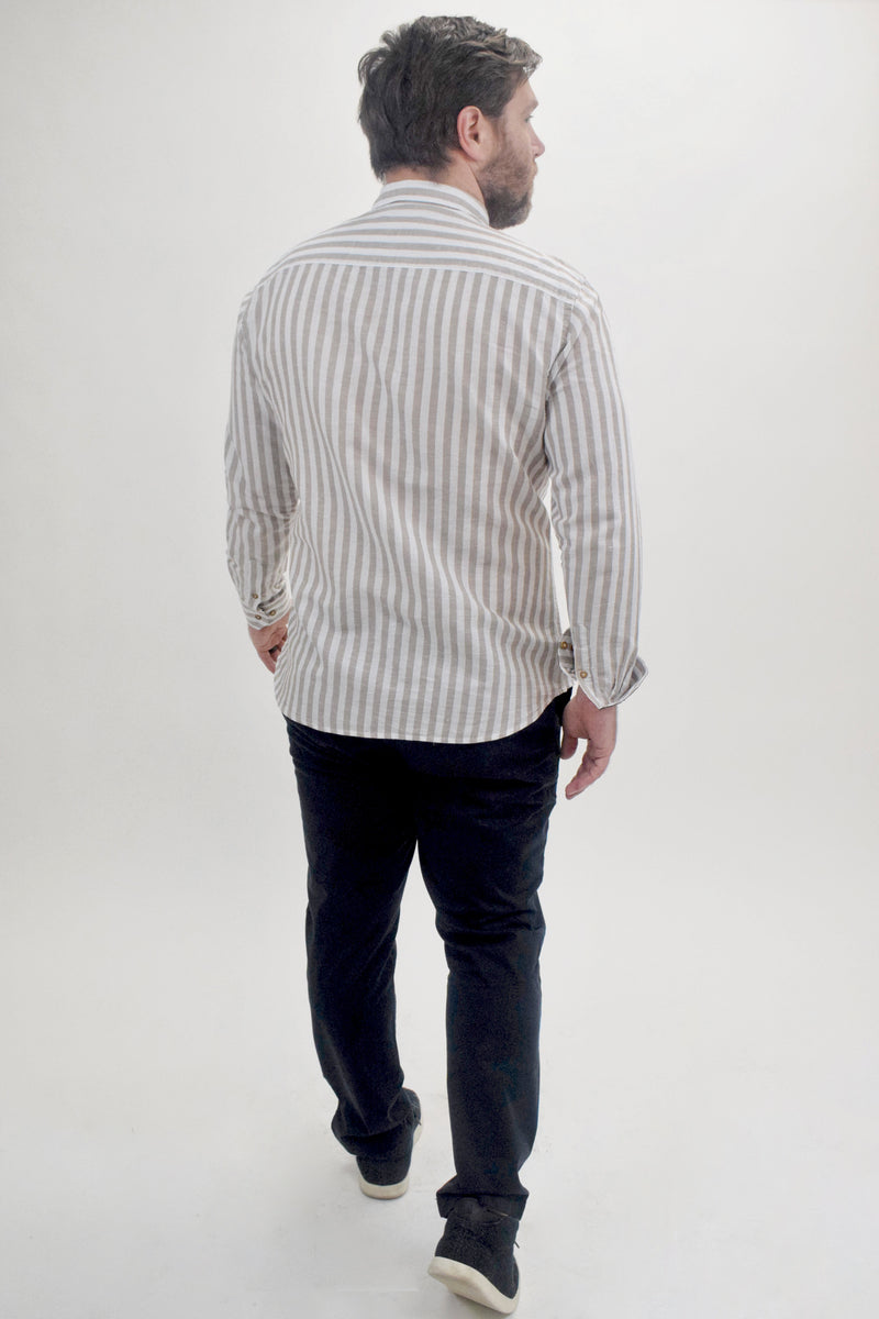 Crafted by Spazio, this casual button-up shirt features a classic preppy style with thick vertical stripes in white and beige, creating a smart yet relaxed aesthetic. Made from lightweight linen, it's ideal for warm weather wear or year-round versatility. A traditional collar neckline complements the shirt's regular fit, while the striped pattern offers a touch of timeless elegance suitable for various occasions. Pair with the Projek Raw Military Green Chino Bungee Pant and layer with the Civil Society Heather Tan Structured Knit Shirt Jacket for a versatile winter look suitable for work or the weekend.