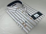 Spazio White & Beige Thick Vertical Stripe Linen Long Sleeve Button Up Shirt