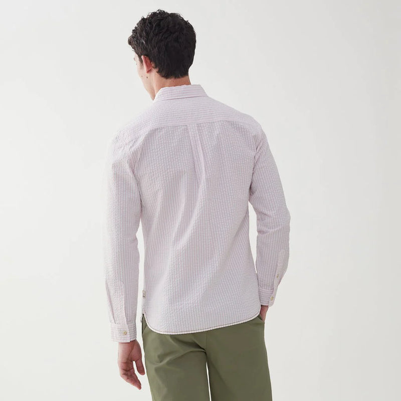 Introducing the Surfside Supply Seersucker Button-Up Shirt, a perfect blend of classic style and modern comfort. This lightweight, long-sleeve shirt features a subtle striped pattern in a soft pink hue, enhanced by gold-stitched hems and pearlized buttons. Crafted from 100% cotton seersucker fabric, it offers a breathable and textured feel, making it ideal for year-round wear. The button-up design and single chest pocket add a touch of sophistication, making it a versatile addition to any wardrobe. For a relaxed yet polished look, pair this shirt with khaki chinos and loafers for a business casual day at the office. Alternatively, wear it with tailored shorts and boat shoes for a vacation or resort getaway. This shirt is also perfect for a casual wedding, offering a refined yet comfortable option for such occasions. Mix it up with some spring color with the Surfside Supply button up, or opt for the Selected Homme polo or Dylan Gray polo on a hotter day.